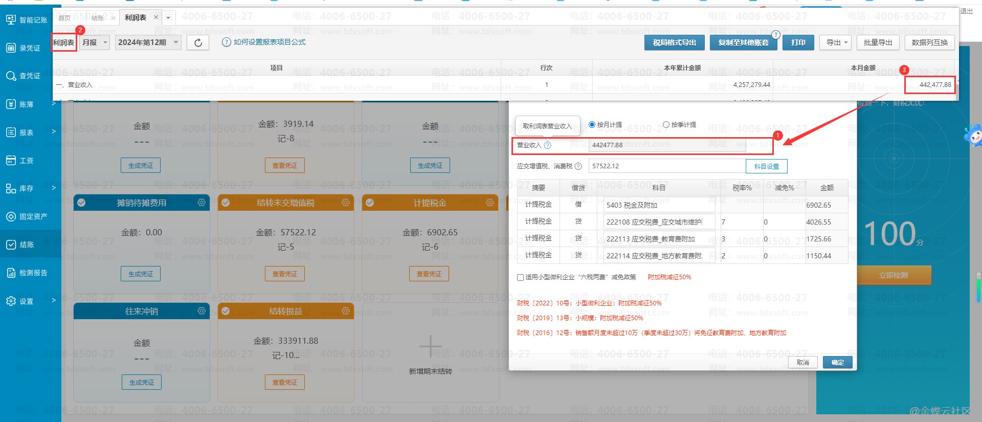 点击营业收入的问号会显示营业收入的金额是取利润表营业收入。结转方式选择按月计提,则取利润表营业收入月报的本月金额;结转方式选择按季计提。则取利润表营业收入季报的本期金额。