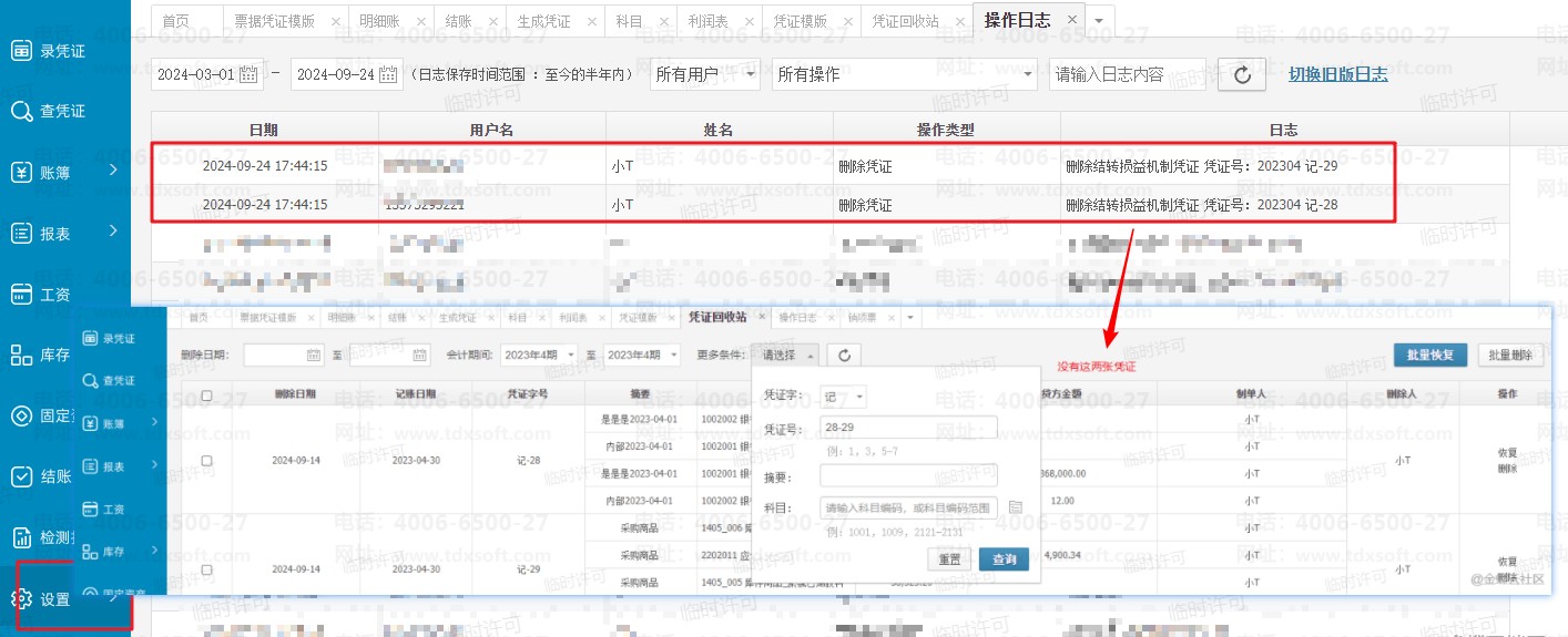在操作日志中显示2024年9月24日17:44:15删除了两张结转损益凭证,但是凭证回收站中并没有发现删除的这两张凭证,怎么处理?
