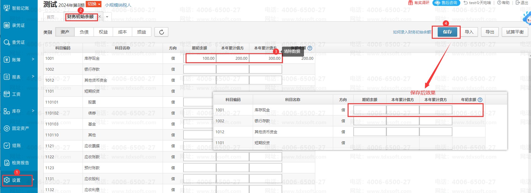 2、【设置】→【财务初始余额】→选择对应的科目清除数据→【保存】即可。