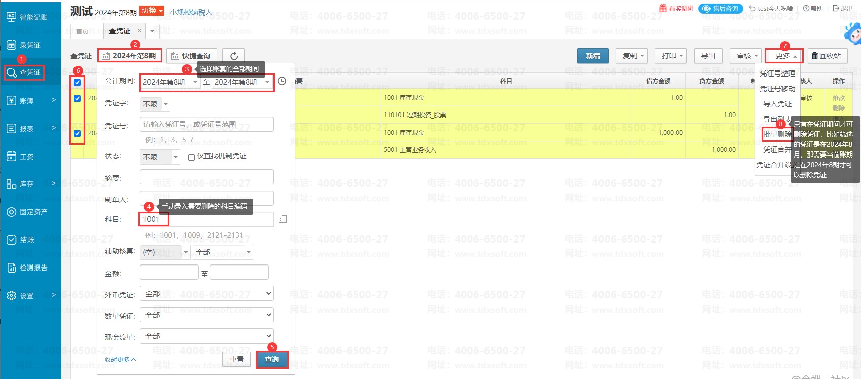 1、【进账套】→【查凭证】→筛选凭证→勾选当前账期的凭证进行删除。