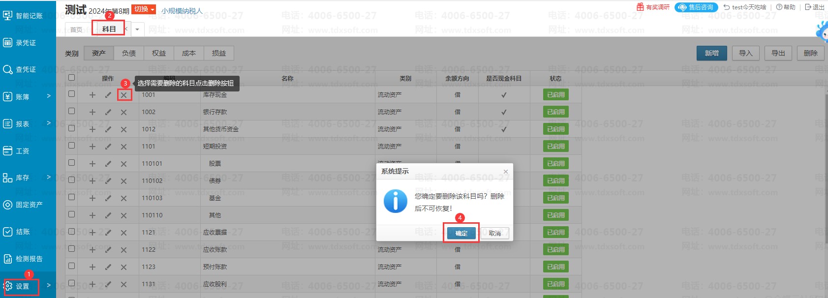 3、【设置】→【科目】→选择需要删除的科目点击删除按钮,点击【确定】即可。