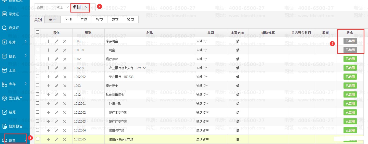 3、为了后期方便也可以把原科目设置成【禁用】状态,后续做账用新科目。
