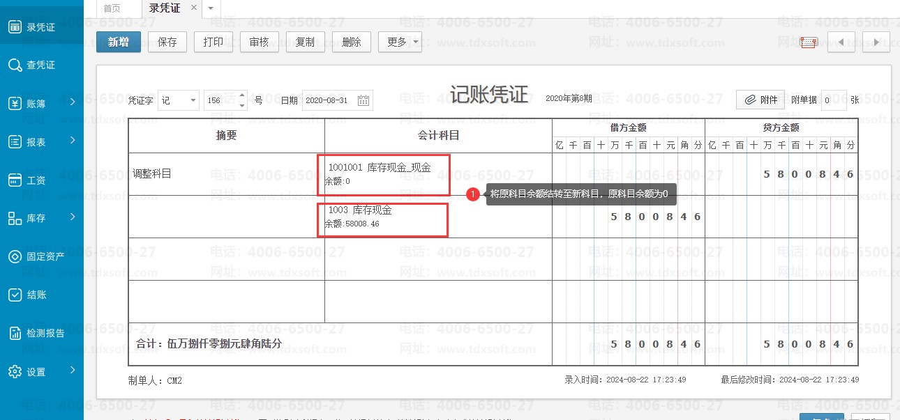 2、将原错误的科目1001余额转到1003科目,录入调整科目的凭证后,1001科目余额显示为0;