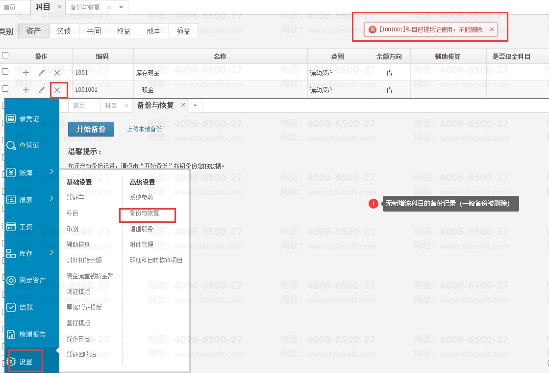 账无忧误增下级科目无法删除如何处理针对备份被删除的情况