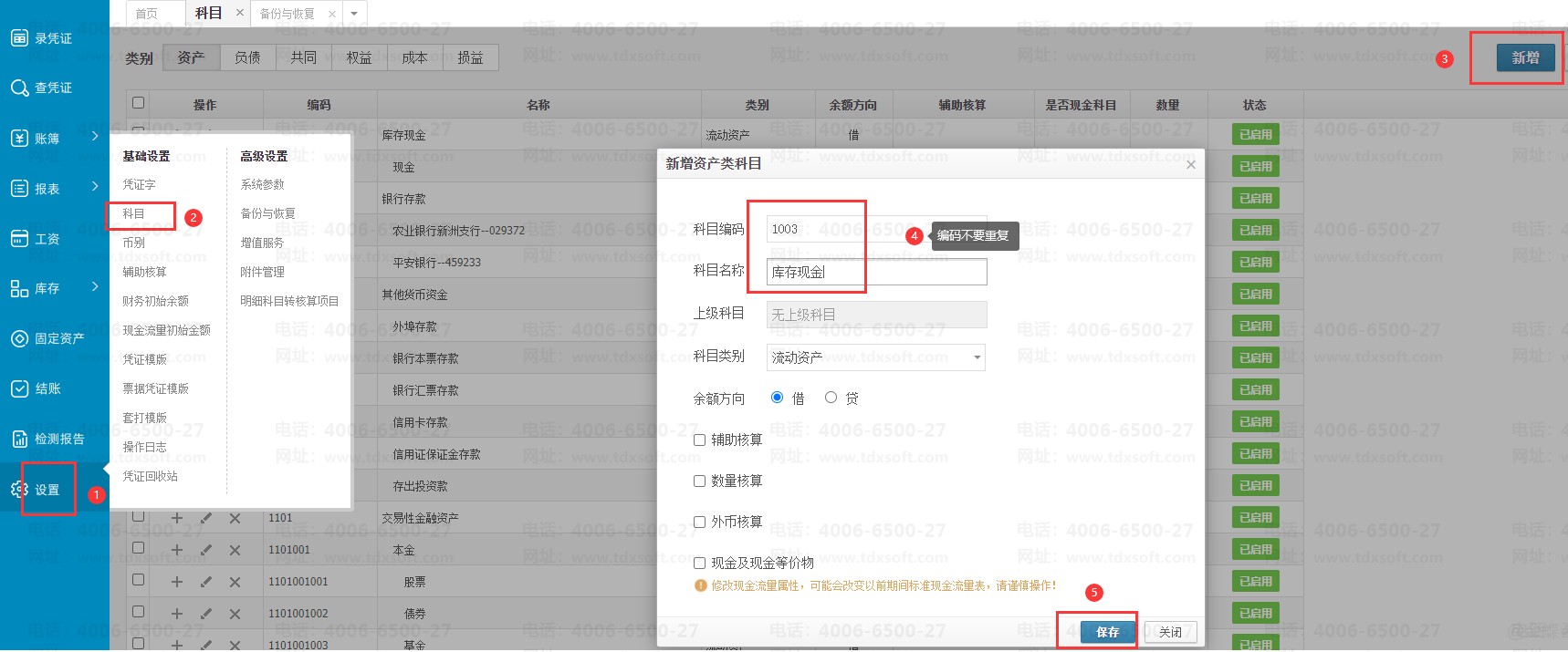 1、打开【设置】-【科目】界面右上角新增一个新的科目(编码不重复),比如1003;
