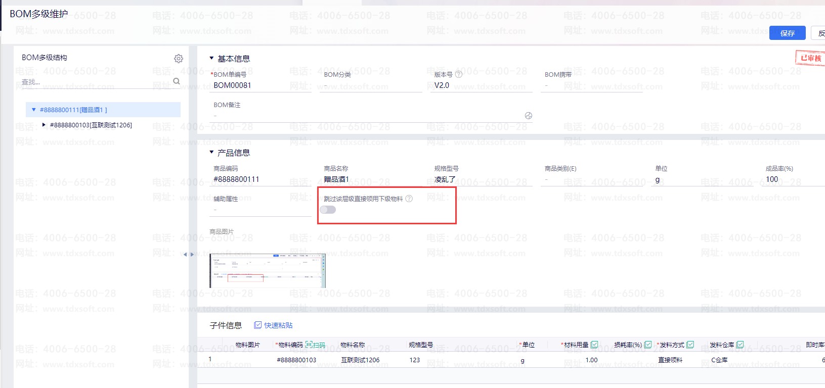 企业在生产任务不紧张时,会预装某些成品的零部件,然后进行入库,但是正常情况下这些零部件会在生产线上流转不入库;这就要求产成品的BOM中要有组成零部件的物料,即按照产成品下达生产任务单时,可以直接领用组成零部件的物料。同时这些零部件本身也需建立BOM单,这样就互相矛盾了。
