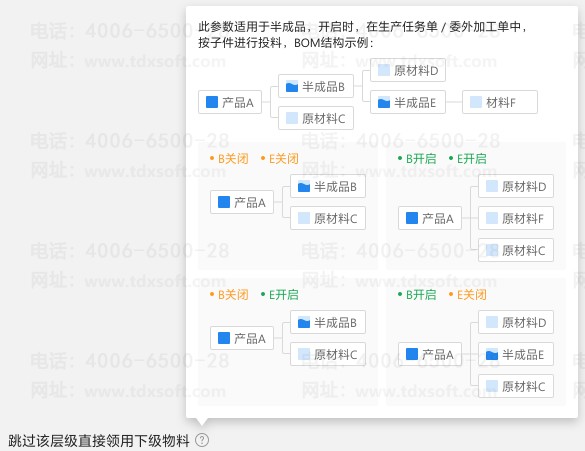 在BOM单上有个参数叫”跳过该层级直接领用下级物料“,也称”BOM跳层“,当启用了该参数时,下达产成品的生产任务单可直接领用零部件的下级物料,同时物料需求建议也可直接计算零部件的下级物料。