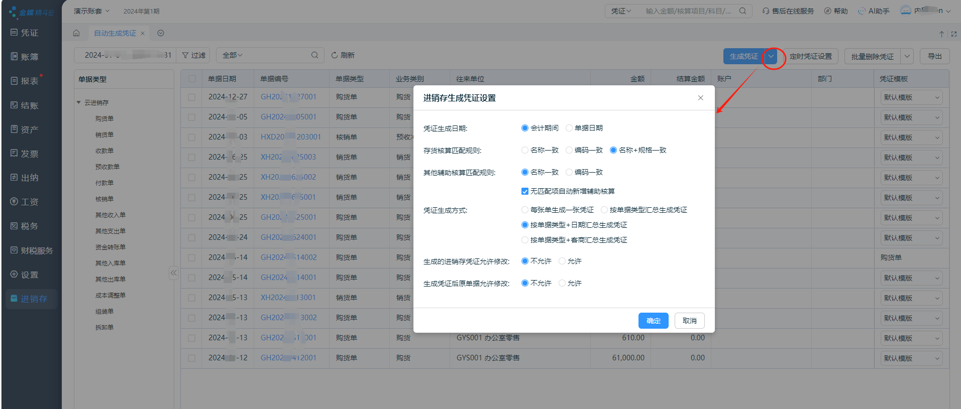 在自动生成凭证界面,点击【生成凭证】下方的【进销存生成凭证设置】,可以对相关参数进行设置。