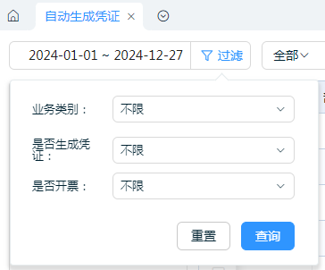 业务单据生成凭证:增加日期、业务类别、是否生成凭证、是否开票以及单据编号、往来单位等进行筛选。