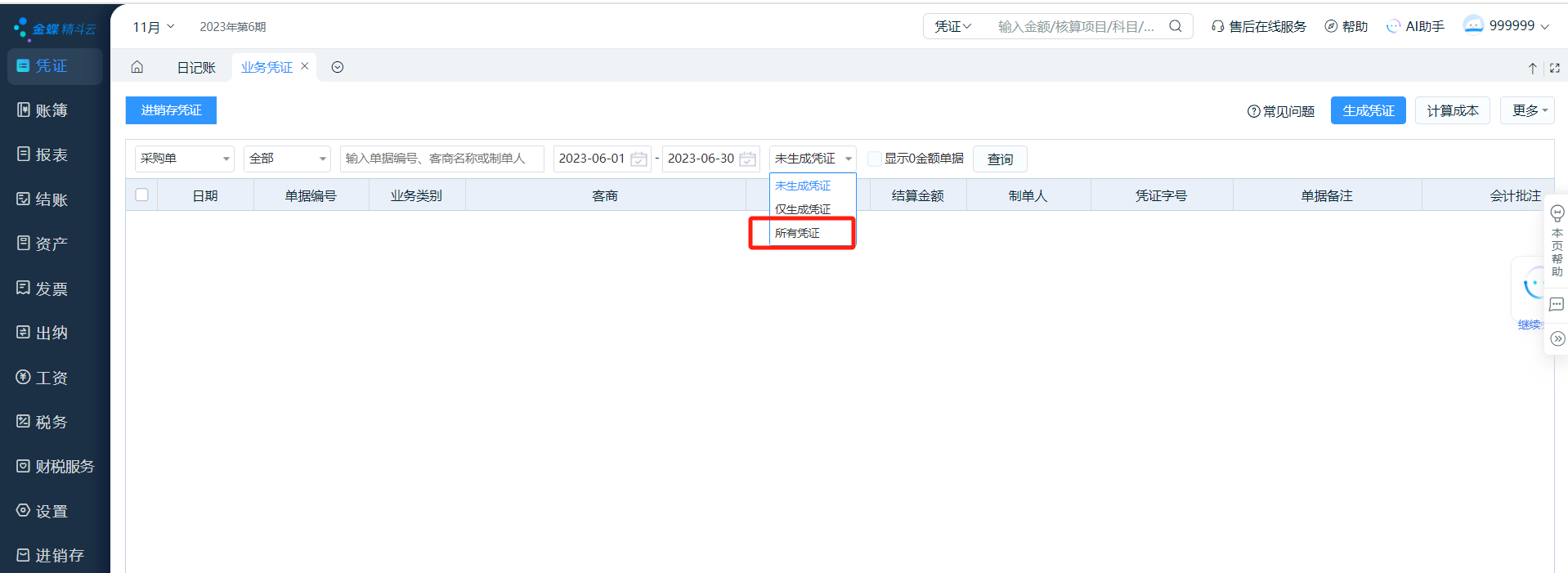 单据是否生成凭证筛选,这里可以筛选全部凭证